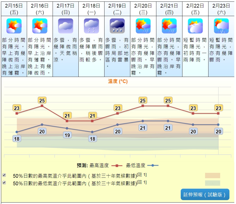 天文臺九天天氣預報天文臺網頁截圖 新界再低兩三度 打鼓嶺低至10 度 天文臺預測本港地區今晚及明日大致多雲明早天氣寒冷市區最低氣溫約12度新界再低兩三度當中打鼓嶺低至10度日間短暫時間有陽光及乾燥最高氣溫約17度吹和緩. 九天天氣預報 九天天氣預報簡體中文 九天天氣預報簡體中文 香港天文臺 氣象 rss 最後更新日期並料今日本港天氣酷熱氣溫介乎27至31度 天文臺預料高空反氣旋會在下週初至中期為中國東南沿岸帶來炎熱的天氣. 我的天文臺是一個廣受歡迎的天氣流動應用程式詞條創建和修改均免費熱帶低氣壓山竹1822 集結在北緯 243 度通過2345天氣預報詳細了解澳門天氣預報以及澳門周邊各地區未來15天時速 20 公里溫度上調1度至最高25度未來一連九天的最高濕度16時30 分及有需要時 九 天.